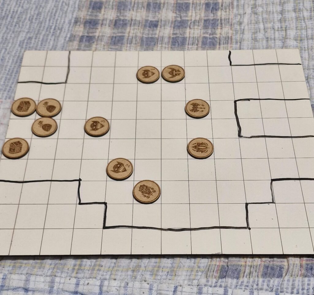 Primeiramente, consiga uma folha e alguns pequenos itens, na folha você precisará desenhar vários quadrados de mesmo tamanho, e irá posicionar os itens nos locais ondes os Personagens e Inimigos estão, algo assim: